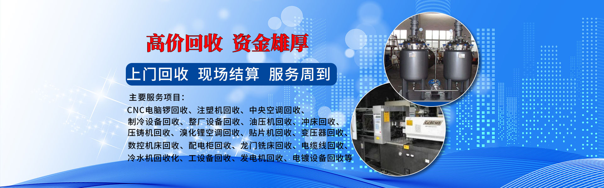 整厂设备回收,回收各类结业及转型工厂设备、搬迁工厂闲置设备、工厂淘汰旧设备、法院拍卖旧设备、社会公开拍卖旧设备,工厂或公司招标竞价买卖旧设备、电厂旧设备、变电站旧设备,建筑、工程旧设备,回收各种旧机械、旧发电机、旧变压器、旧中央空调、旧小空调、旧大型锅炉、旧模具、旧电梯、旧电缆线、旧流水线等。